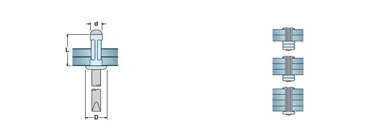 The Unigrip rivet is a member of the structural rivet family: it is a product that, because of its technical characteristics, has a larger clamping capacity than the standard rivet, thus allowing a single rivet to cover thicknesses that would instead require several sizes of standard breakstem rivets. It is particularly suitable for soft materials such as plastic or thin sheets because the rivet’s pressure on the surface is lower.