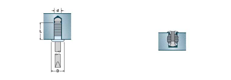 Rivetto con boccola rullata. La rullatura della testa del rivetto è particolarmente efficace per garantire una presa efficace in caso di fori non passanti e per fissaggi di materiali come il legno o nell’edilizia. Disponibile nella gamma di diametri standard e in diversi spessori serrabili.